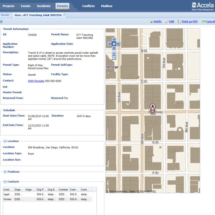 In September 2015, San Diego began migrating to the Accela Civic Platform, and the Accela ROW Management Module was selected as the replacement for IMCAT. Quartic was brought in to lead the creation, integration, and management of GIS data and processes into the new system. We also created a public-facing custom web app for ArcGIS Online.
