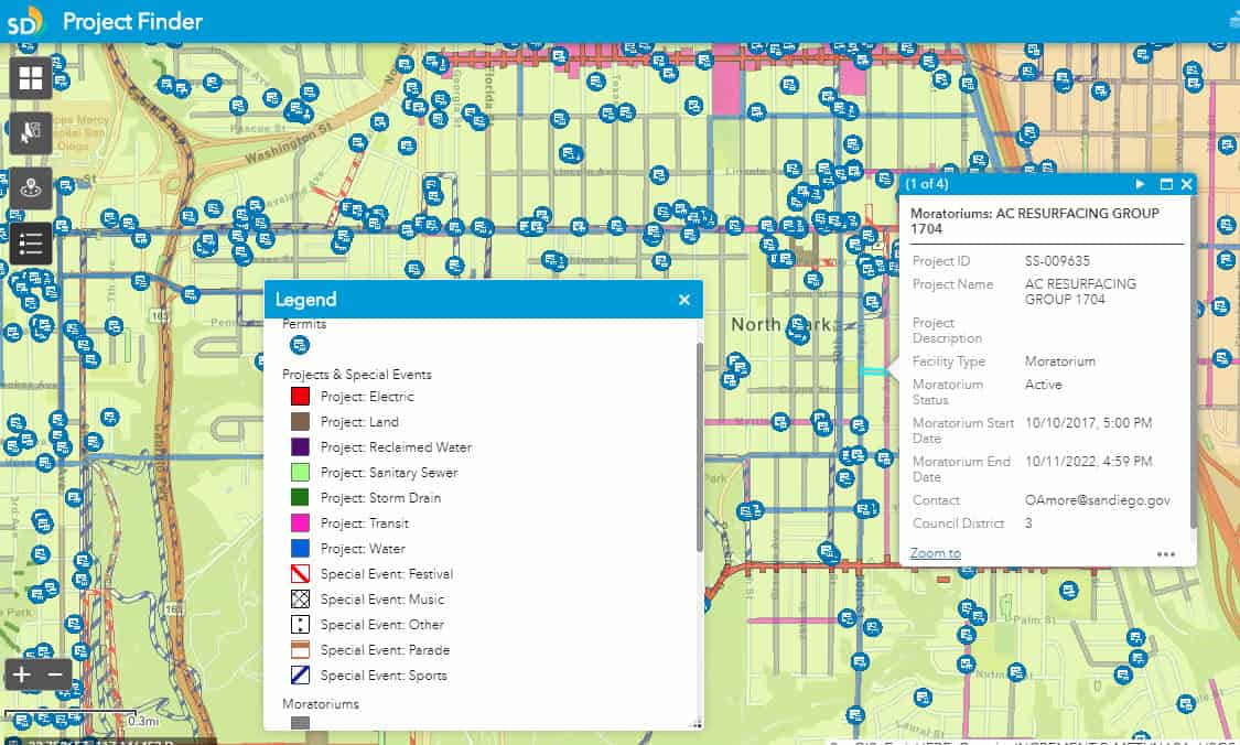 The Project Finder Web App uses much of the same data as the Accela ROW Management module. Python scripts were created to access the source data and refresh the map services every 2 weeks. The app lets citizens see City CIP projects, permits, special events, and moratorium locations. Searches can be done by address and filtered by project type. Project details and contact information are easily viewed by clicking on the map.