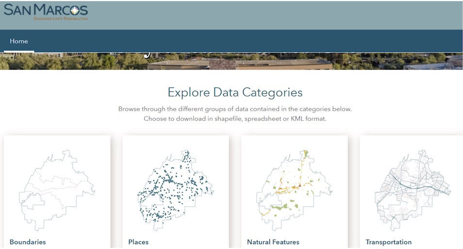 The City of San Marcos wanted to have a way to share mapping data easily and directly with citizens. They developed an easy-to-use website that is now open to the public. The data site hosts a full range of GIS data, most available for download. The data were grouped into categories to make it easier to find specific datasets. Data such as parcels, roads, jurisdiction boundaries, addresses, parks, trees, and more can be downloaded with just one click. Check it out here: City of San Marcos ArcGIS HUB