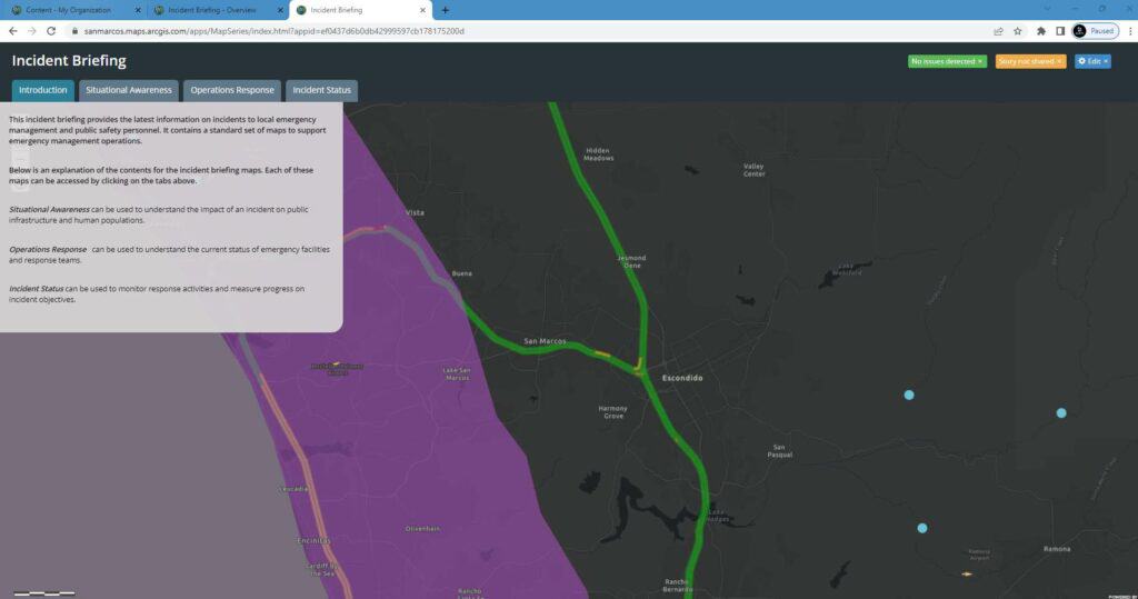 The City of San Marcos, CA Emergency Management Operations has implemented its Incident Status Dashboard using Esri’s State and Local Government Tools. The Dashboard is a comprehensive web-based tool that offers information that may be used to make decisions and enables staff to give more effective incident briefings.
