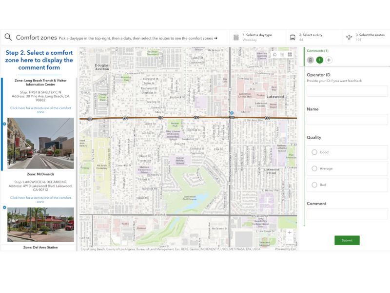 Quartic combined Survey123 with ArcGIS Dashboards to create a dashboard with one map that the driver can filter by their duty number, weekday, and/or route. When a driver clicks on a comfort zone, they see a picture of the rest stop, the building address, and a link to Google Streetview. A right-side panel on the dashboard opens a Survey123 form where the driver can add or view comments concerning the comfort zone.