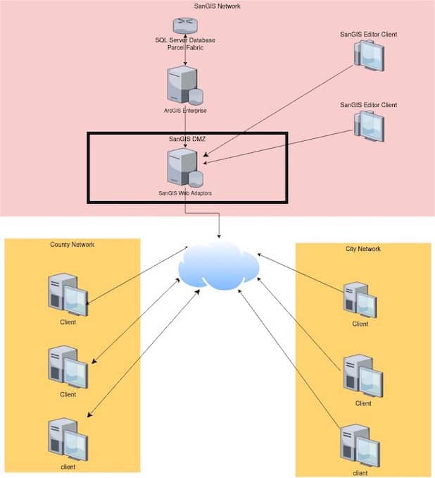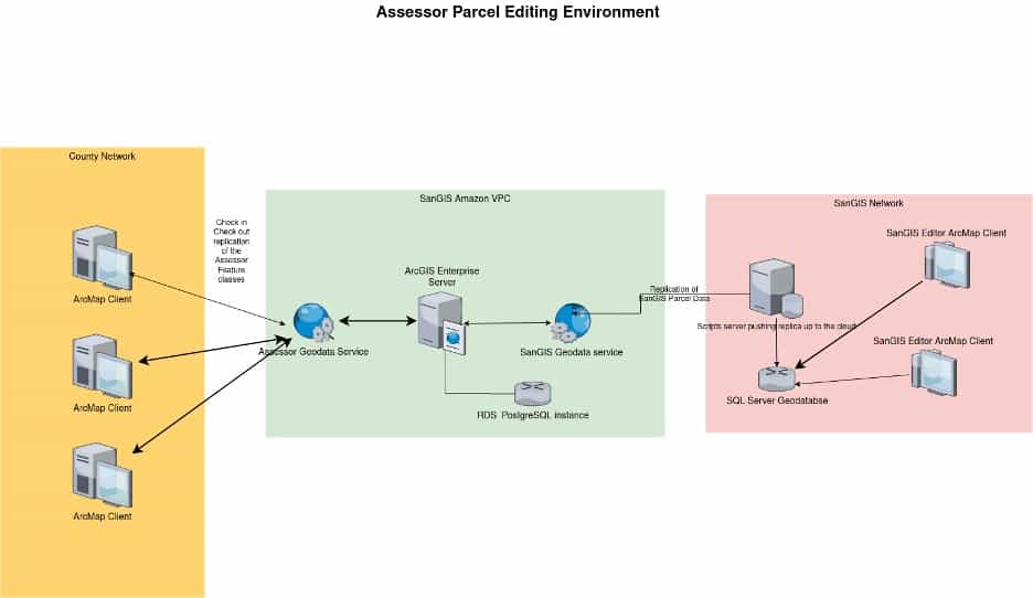 There are many departments within the stakeholders’ organizations, such as Sheriffs, Fire, and Assessors, who all need to be able to update parts of the SanGIS geodatabase. Because many of the Departments have separate networks, in the past shared editing was accomplished via two-way replication of feature classes to an ArcGIS Enterprise deployment in the cloud. The external organizations could then edit via their own check-out, check-in replica workflows. While effective, this model led to a lag between updates being shared as well as communication problems.