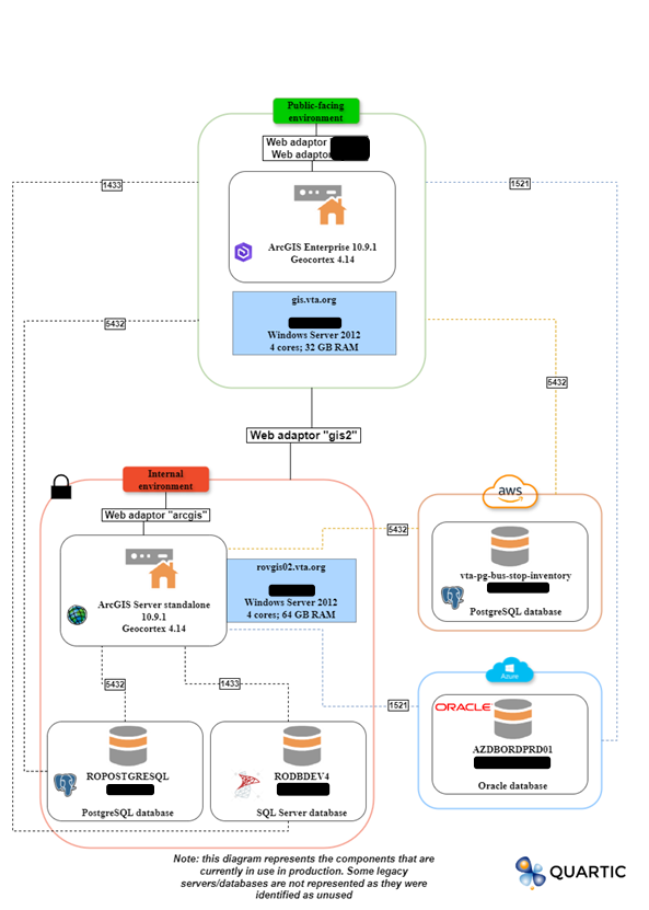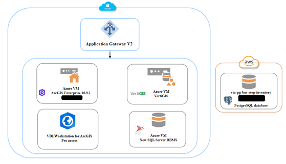 VTA was facing a complex, aging GIS environment affected by performance issues, fragmented data, and a growing maintenance burden. Over the years, VTA’s GIS environment had grown in multiple, uncoordinated directions. There were several ArcGIS servers and databases (SQL, Oracle, PostgreSQL) and aging on-premises infrastructure. This patchworked system was difficult to maintain, slow to load, challenging to scale-up, and prone to outages.