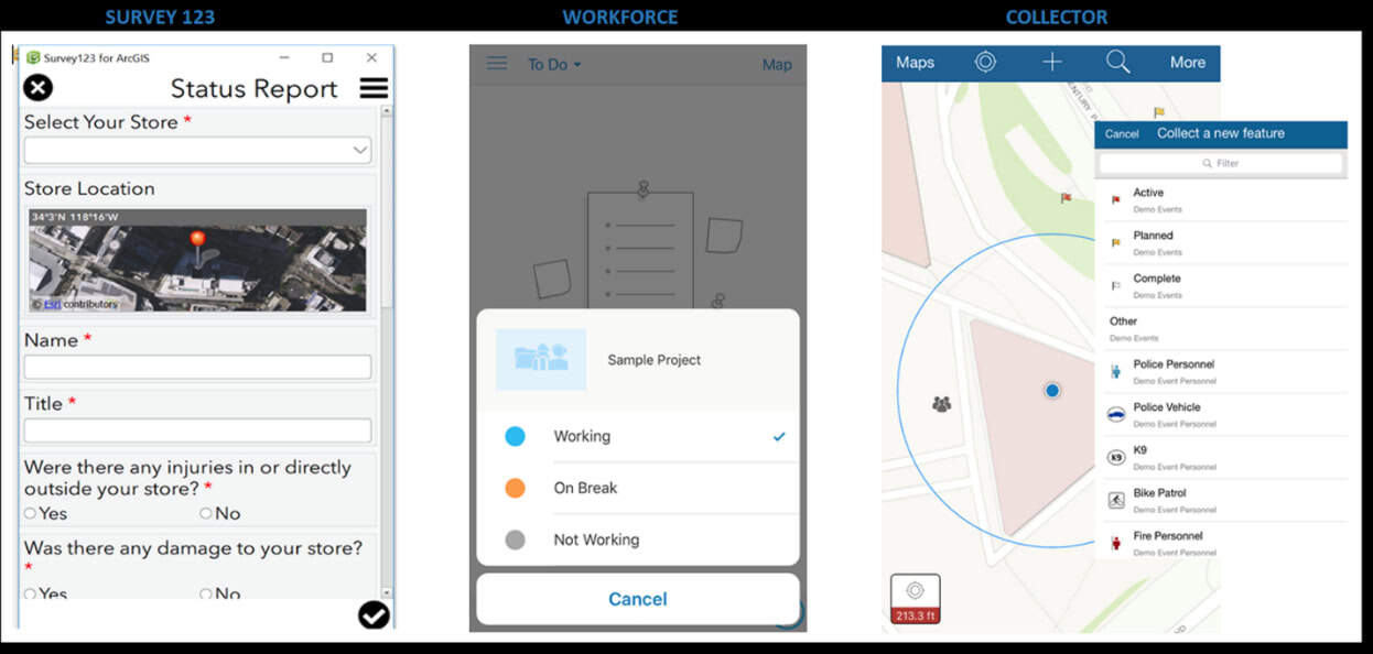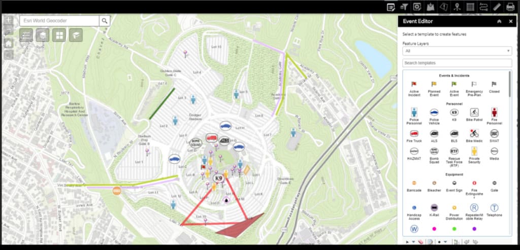 Using Workforce, the EOC can easily see where staff resources are moving during an event using GPS tracking. In a crisis, this information would help to quickly identify who should respond where. Custom surveys can be created using Survey123 to allow the field crew to send up-to-date information to the command post. One real-world way this has been used is to monitor the status of city-run emergency shelters during a fire. These shelters could use Survey123 to report how many people had checked into the shelters and the current status of their supplies. In addition, this could be used at an event to record the number of people seeking aid at aid stations or for vendors to report the status of their shops and the number of injuries in a crisis.