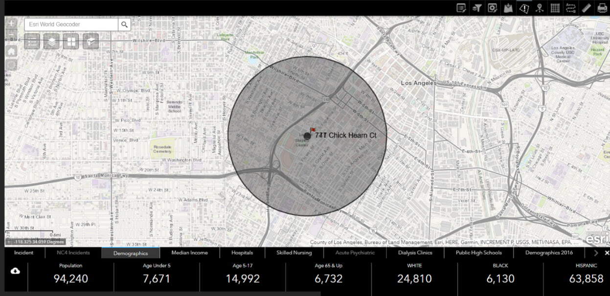 In addition, the situational awareness widget in Web AppBuilder can be used if an incident happens to quickly find the nearest resources, such as hospitals or aid stations, or to better understand the demographics.