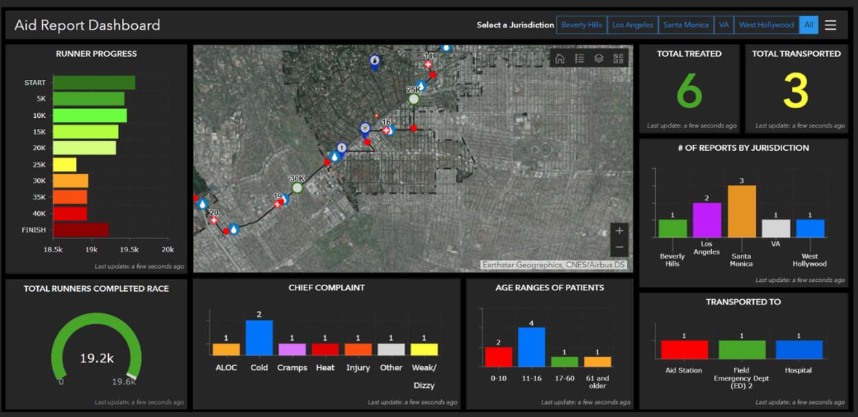 In addition, ArcGIS Online applications provide multiple agencies with the unique opportunity to coordinate with each other. This can be especially useful in events that cover large geographic areas, such as races, that may cross several municipal boundaries. Typically, in such scenarios, each agency would keep its records of incidents, such as where their personnel are, how many people visited aid stations for assistance, etc. Now, they can see, in real-time, what the other agencies are dealing with to better prepare their assets and help assist other agencies if needed.